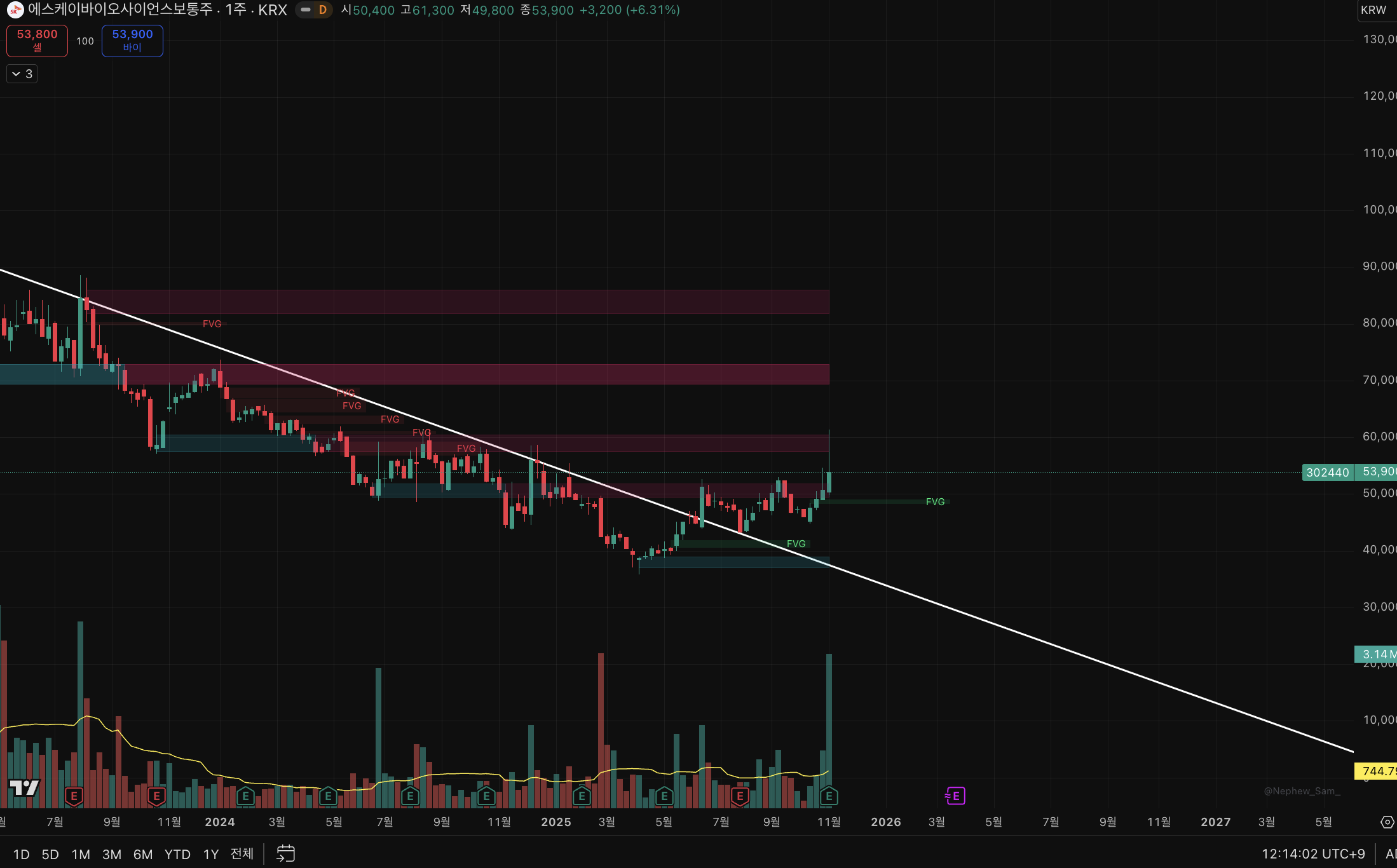주봉 하락추세선을 그려보면 위와 같았다