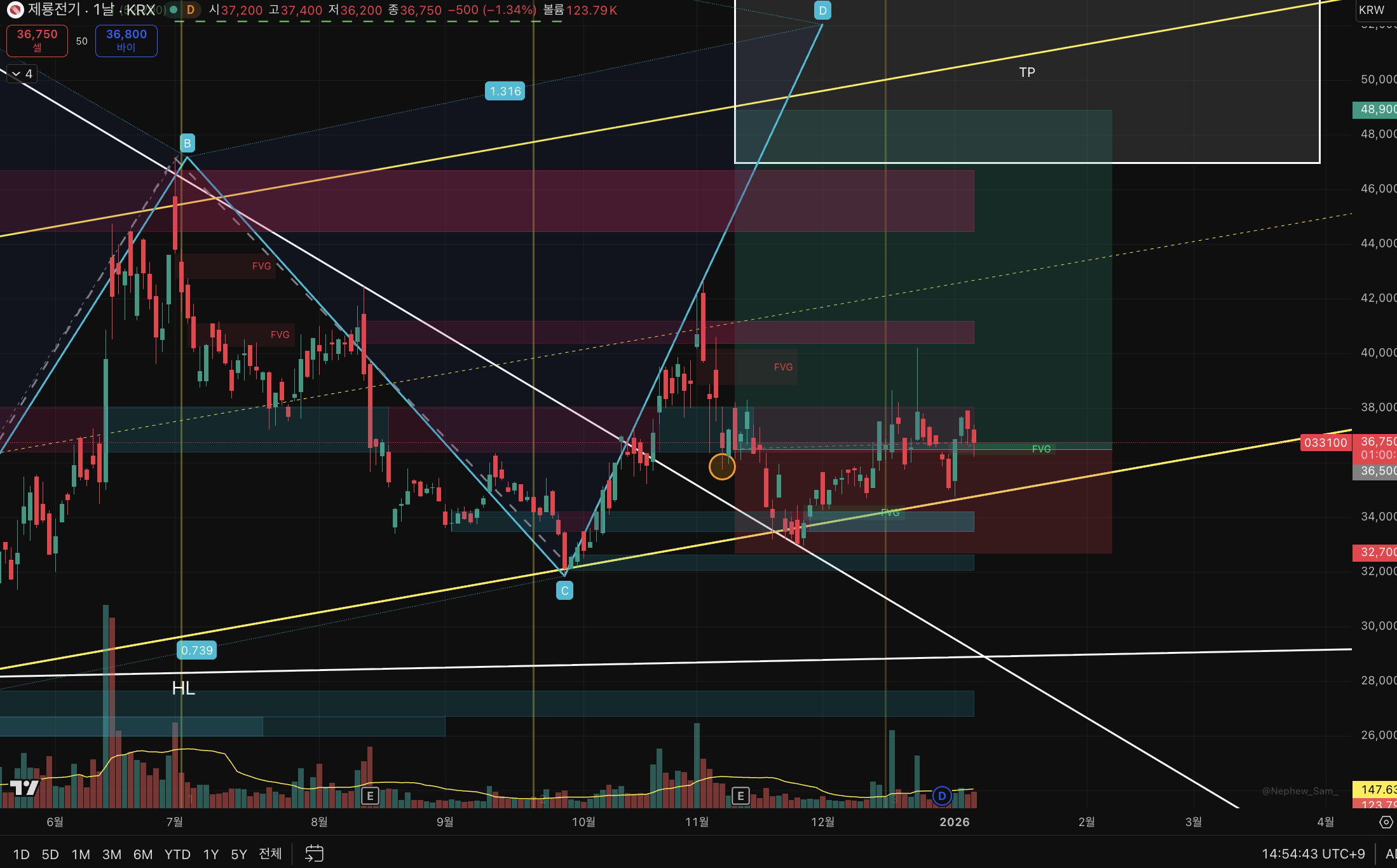 📅 분석 일지: 25. 11. 11. (화)1️⃣ 이제 반등 나오나?##📌 제룡전기(033100)폭이 어마무시하다.. ㅋㅋ 이전 고점들을 이어서 채널을 만들고채널 꼬리 지지까지 확인 주봉으로 보면 지지구간확인이