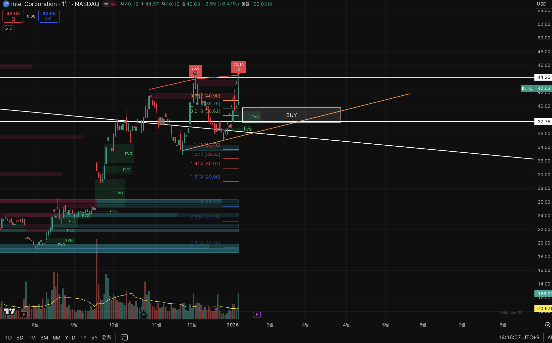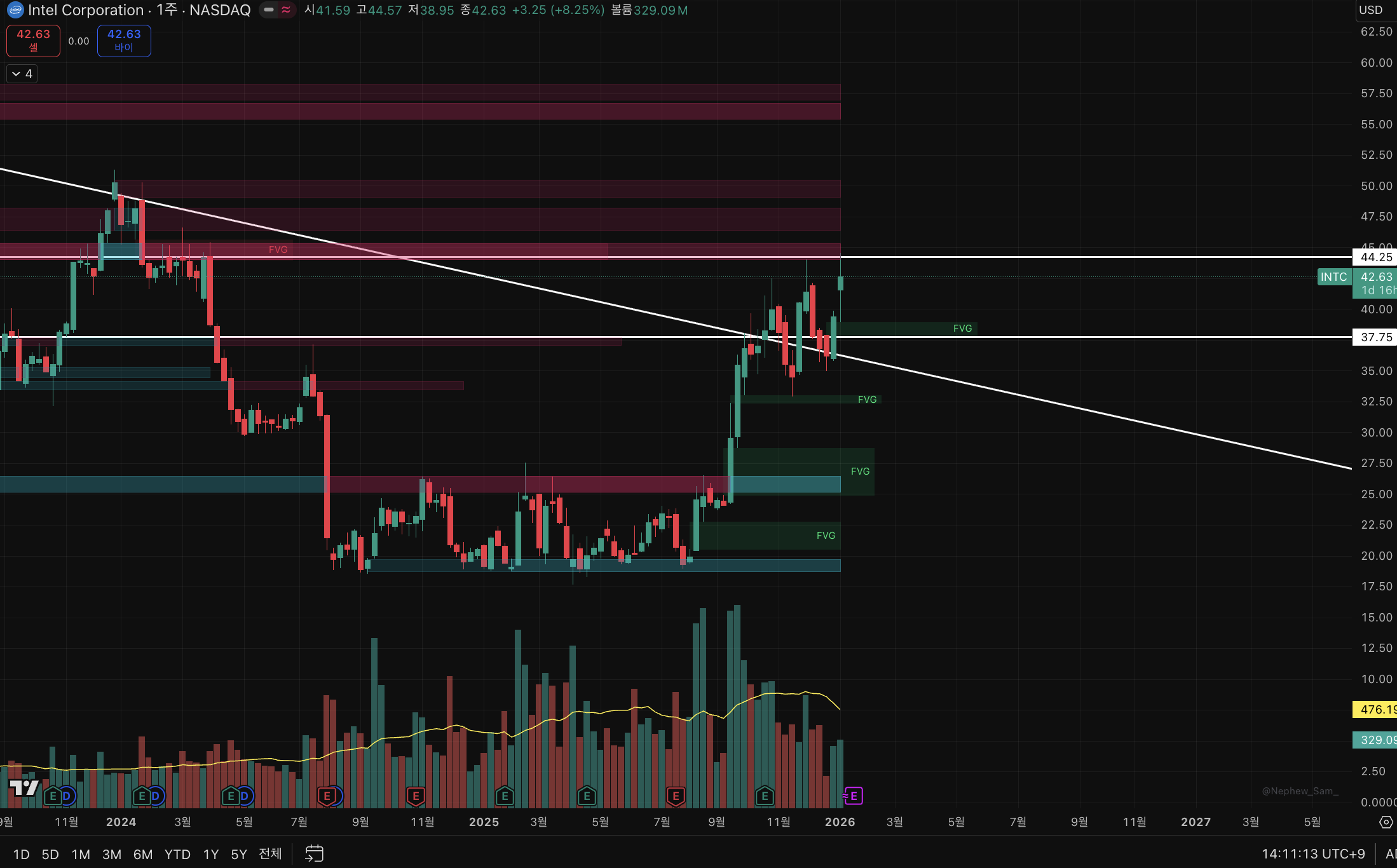 📅 트레이딩 일지: 25. 10. 27. (월)1️⃣ 돌파 후 눌림에서 잡기??##📌 인텔(INTC)인텔 월봉에서 저항/지지 구간을 찾아준다 너무 딱 보이는 자리 위에도 저항 구간 떡하니 보인다 그리고 고점을 이